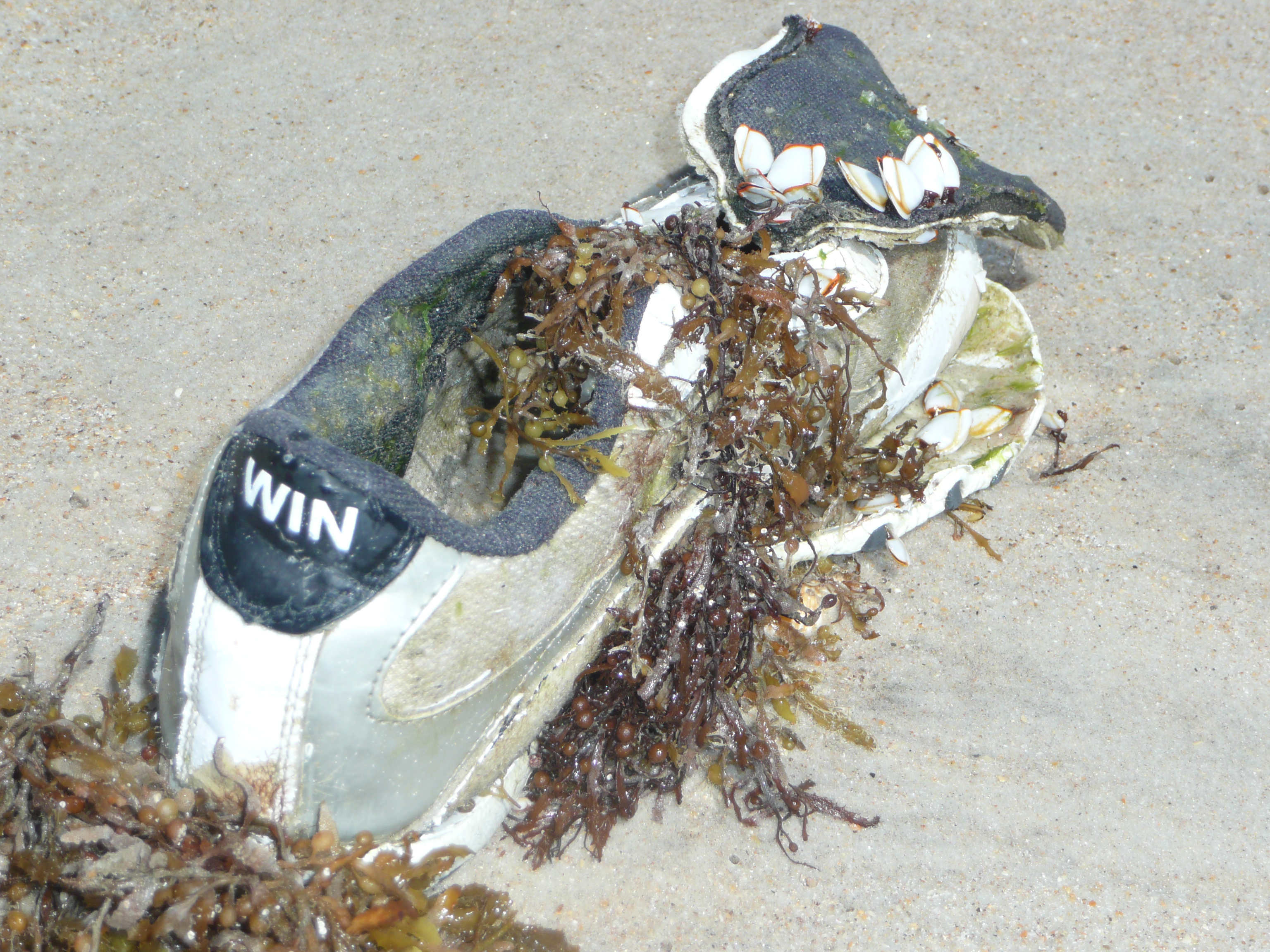 Unfortunately, some beachgoers do not practice the ‘Leave no trace’ rule. This shoe looks like it lost its owner a while ago. See the barnacles?