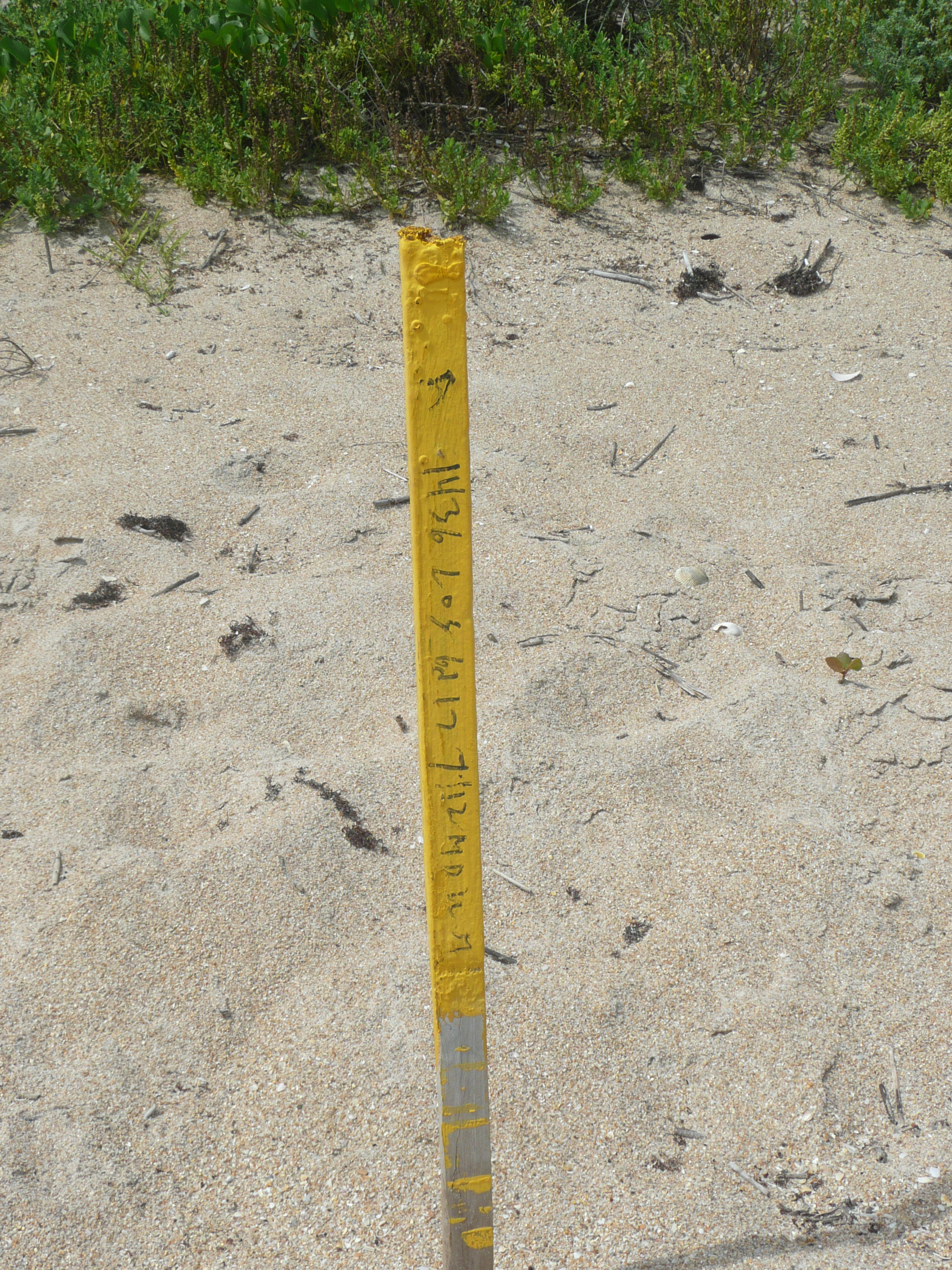 Here and there as we walked we saw yellow stakes like these with dates and numbers written on them. They indicate the location of a turtle’s nest. Some of the numbers are approximate due dates of the hatchlings.