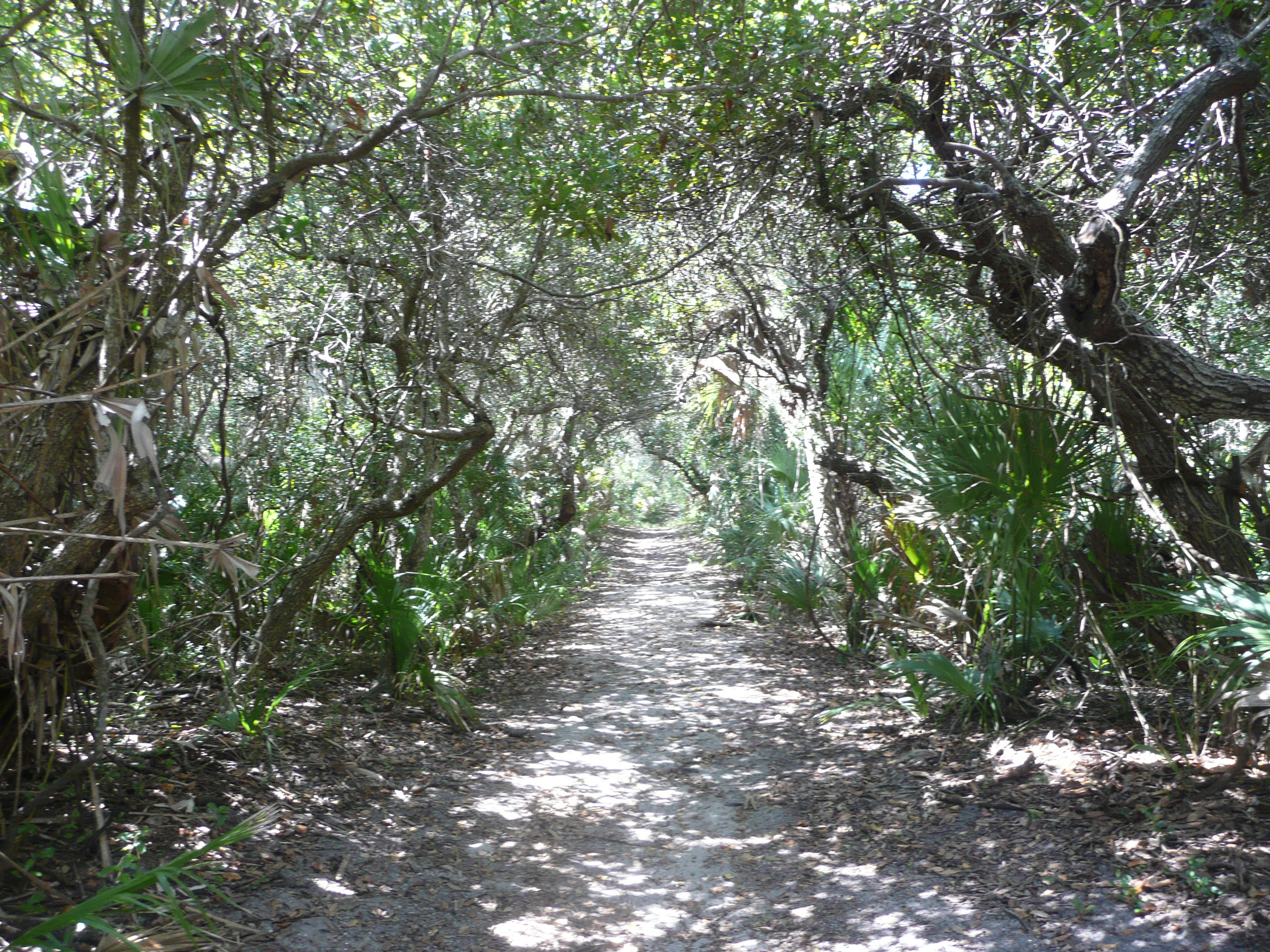 David: The Castle Windy trail was fairly short in length and easily traversed, but could be considered a “mini-adventure”. The trail spanned the width of the barrier island at this point and took us through coastal hammock with red bay, yaupon holly and Atlantic red cedar to the mangrove-edged shoreline of the Mosquito Lagoon. While the sun was almost completely blocked by the dense vegetation beside and overhead the trail, it was steamy-hot as this same vegetation precluded any hope of a breeze. Insect repellent was not something to be considered casually for anyone walking this trail. As fate would have it, neither Jodi nor I brought any and suffered dearly for it. The mosquitoes attacked en masse and it was nothing to “extinguish” a half-dozen mosquito lives with one well-timed smack! Oh well, lesson learned and penalty paid. The rewards were some great pictures and the relative peace of the lagoon at the end. This end of the trail also had the Indian shell middens known as Castle Windy that are the trail’s namesake. Shell middens were, in essence, refuge heaps for the Native Americans that once carved a life from this area. I’m certainly not versed in any of the history involved with these middens, but can understand and respect the need to protect them. Save for the occasional leaping mullet, there was little “action” observed on the lagoon waters. It appeared that some restorative plantings had been installed along the shoreline along with a barrier constructed of oyster shells. Back to the trail which we traversed a bit quicker this time. We emerged at the trailhead and welcomed the sea breeze which both cooled us and kept any lingering mosquitoes at bay.