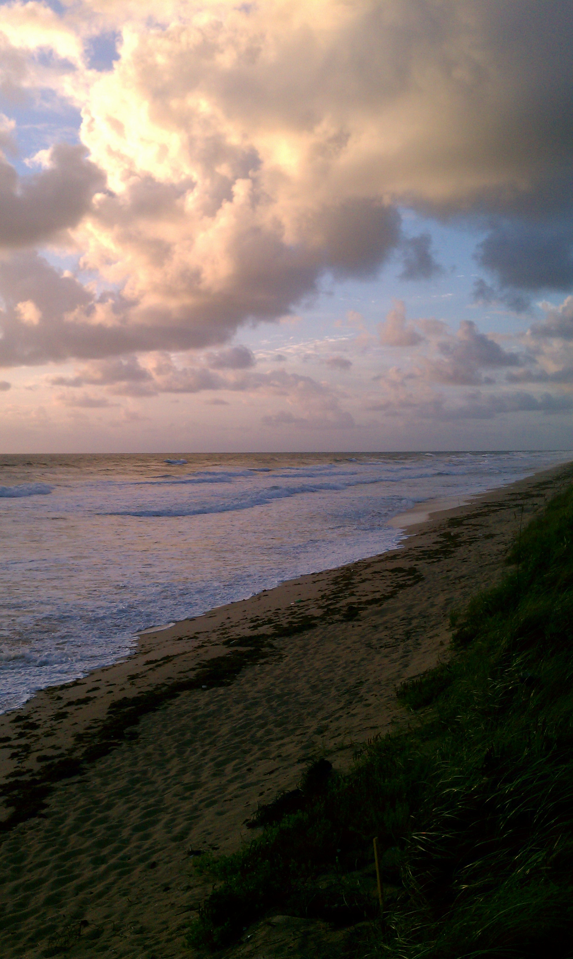 David: We drove through the gate at just before 7:00. The sky was brightening and it was now a race against time and earth’s rotation to get to our spot and set up. We wanted to get to Lot 4 with its observation deck. We made it with a couple of minutes to spare! The wind was blowing straight off the ocean and there was a backdrop of awesome clouds. The surf was pushing high up the beach leaving only a narrow strip of sand between the encroaching waves and the dunes. The pictures that follow were taken over a 20 or so minute time period. Worth the early morning trip? It was for me.