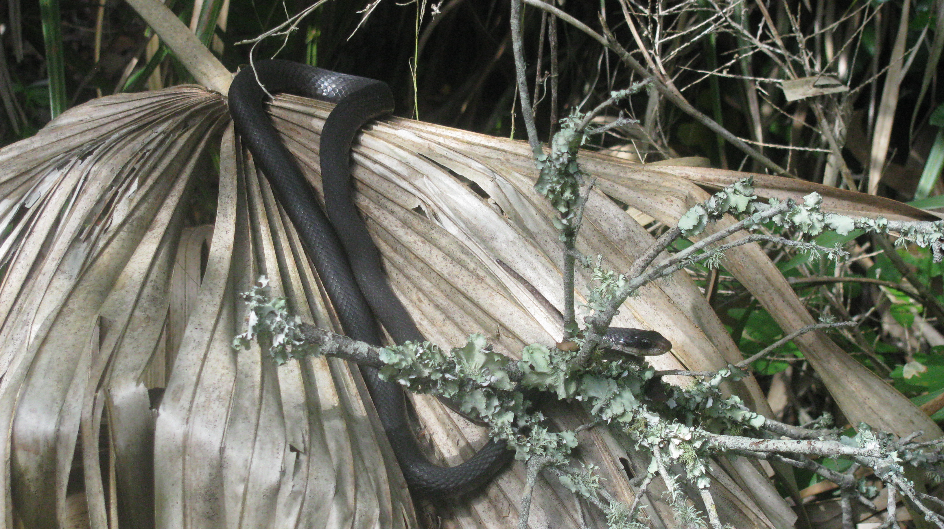 David: We left Lot 5 and headed north to the “loop road” to visit areas we hadn’t seen before. A sign for Parking Area 6 indicated access to a kayak launch. We had to walk a short distance down a path that stretched off into the distance along the shoreline. The launch was a just a narrow clearing in the vegetation which allowed for access to the water…all that was really needed. We did see a lounging black racer on a palm frond. Jodi gave this one a wide berth as we walked back to the car.