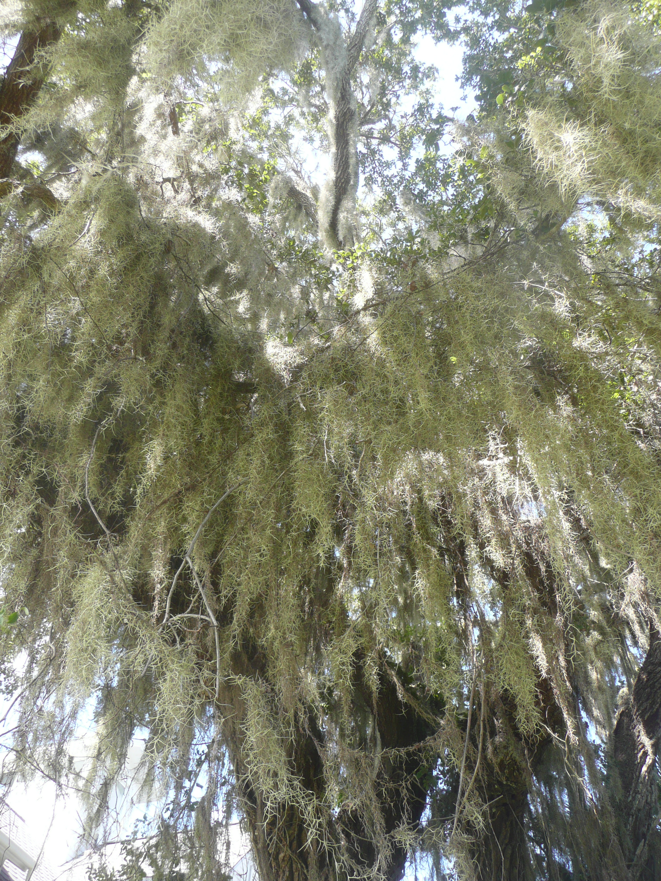 We walked the trail admiring the grounds and walkways. The oak trees were huge and had lots of Spanish moss draping them. Here’s a shot from underneath one.