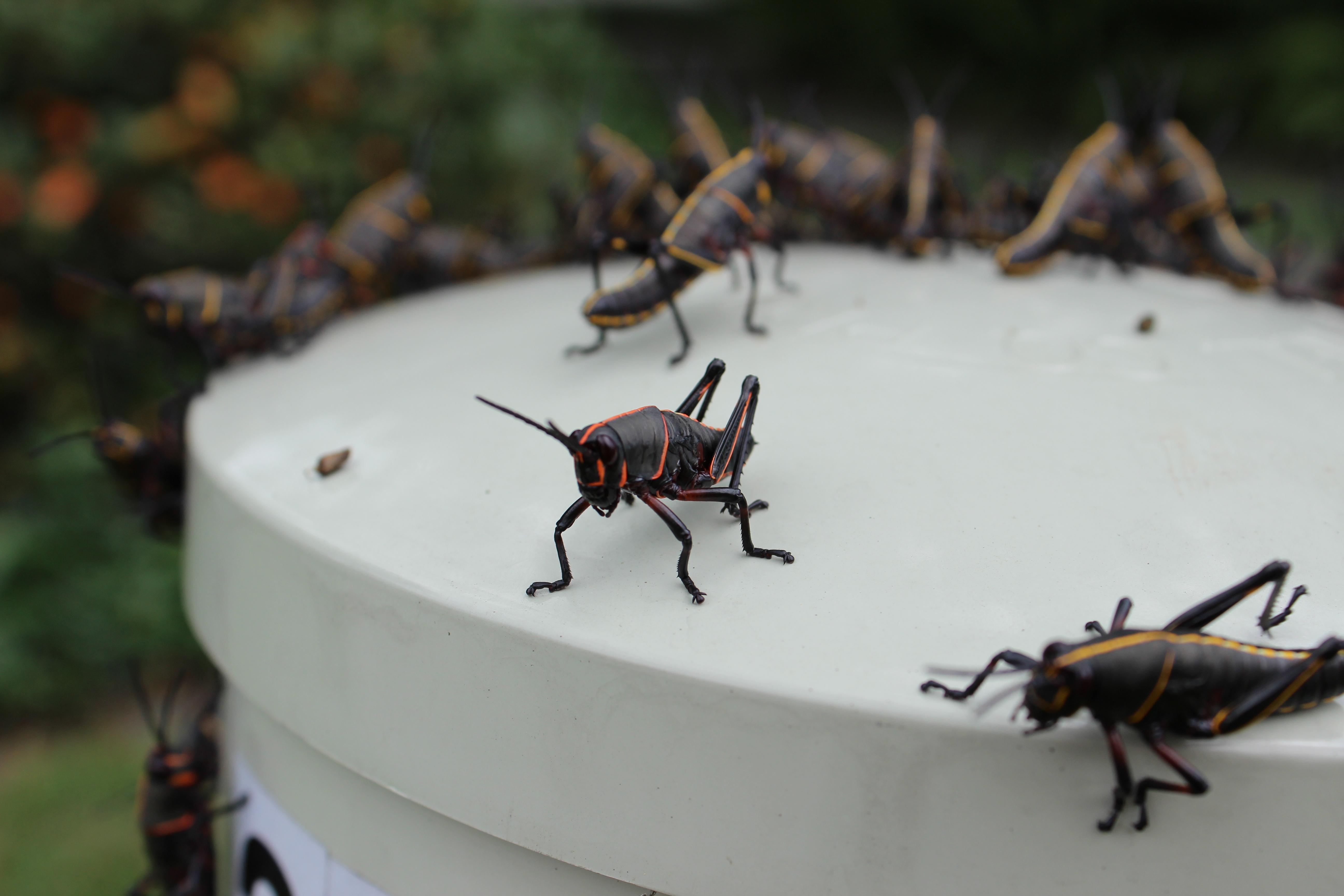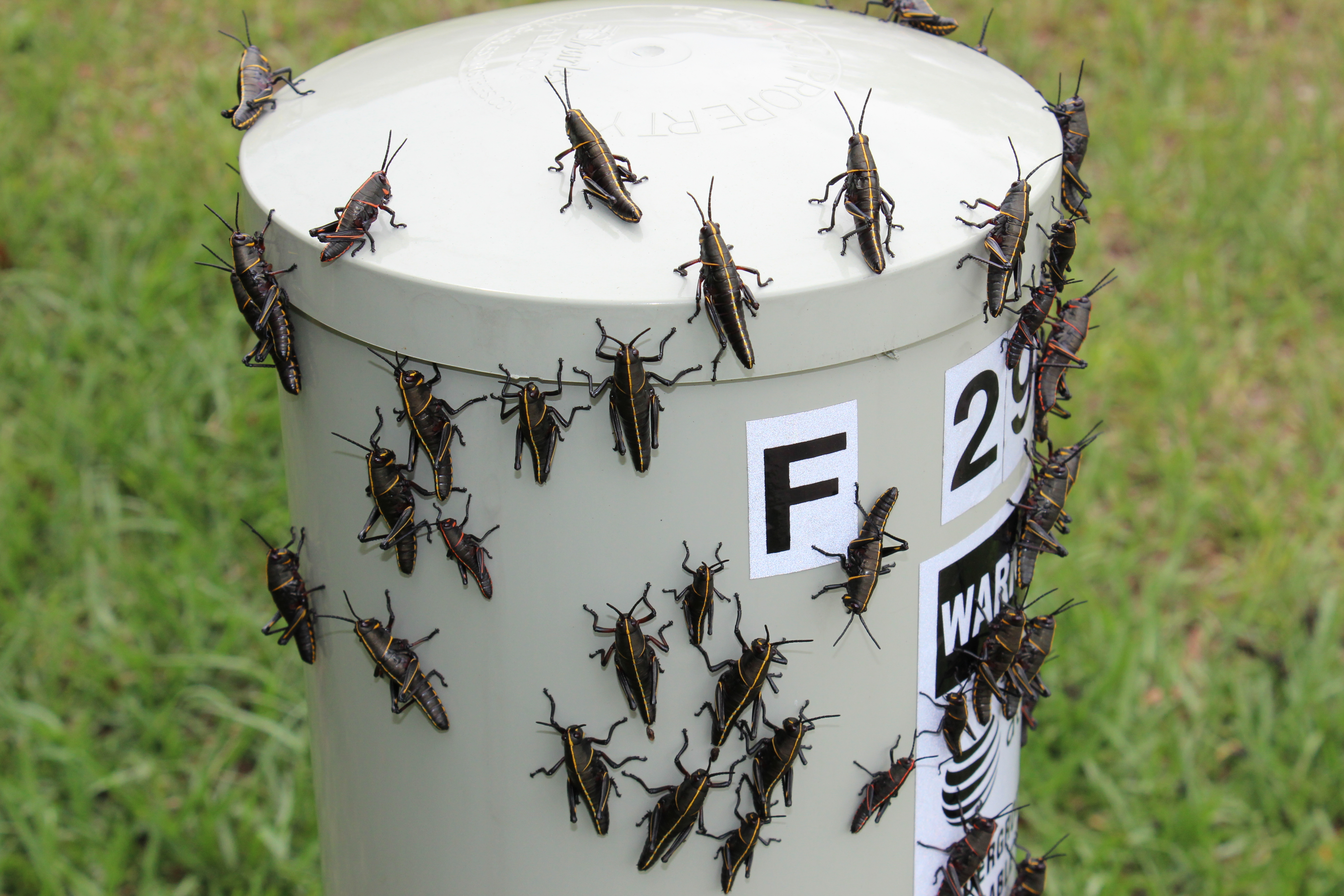 I have no idea what attracted all these eastern lubber grasshopper (Romalea guttata) nymphs to this cable pylon-thing in my front yard. (For a few days, I had my own tourist attraction as several children from the neighborhood would come by to ooh and ahh). These nymphs are immature grasshoppers which, when adults, will be the big, slow moving, green and yellow grasshoppers (“lubbers”) which may be more familiar. It seems that I may have been harboring a “nursery” for these creatures in my yard. In the summer months, adult females dig a small hole in the ground in which they lay their eggs. The young emerge in the spring in the form as seen here. It’ll take them until the summer to be fully mature and begin the whole process again…maybe in someone else’s yard this time!