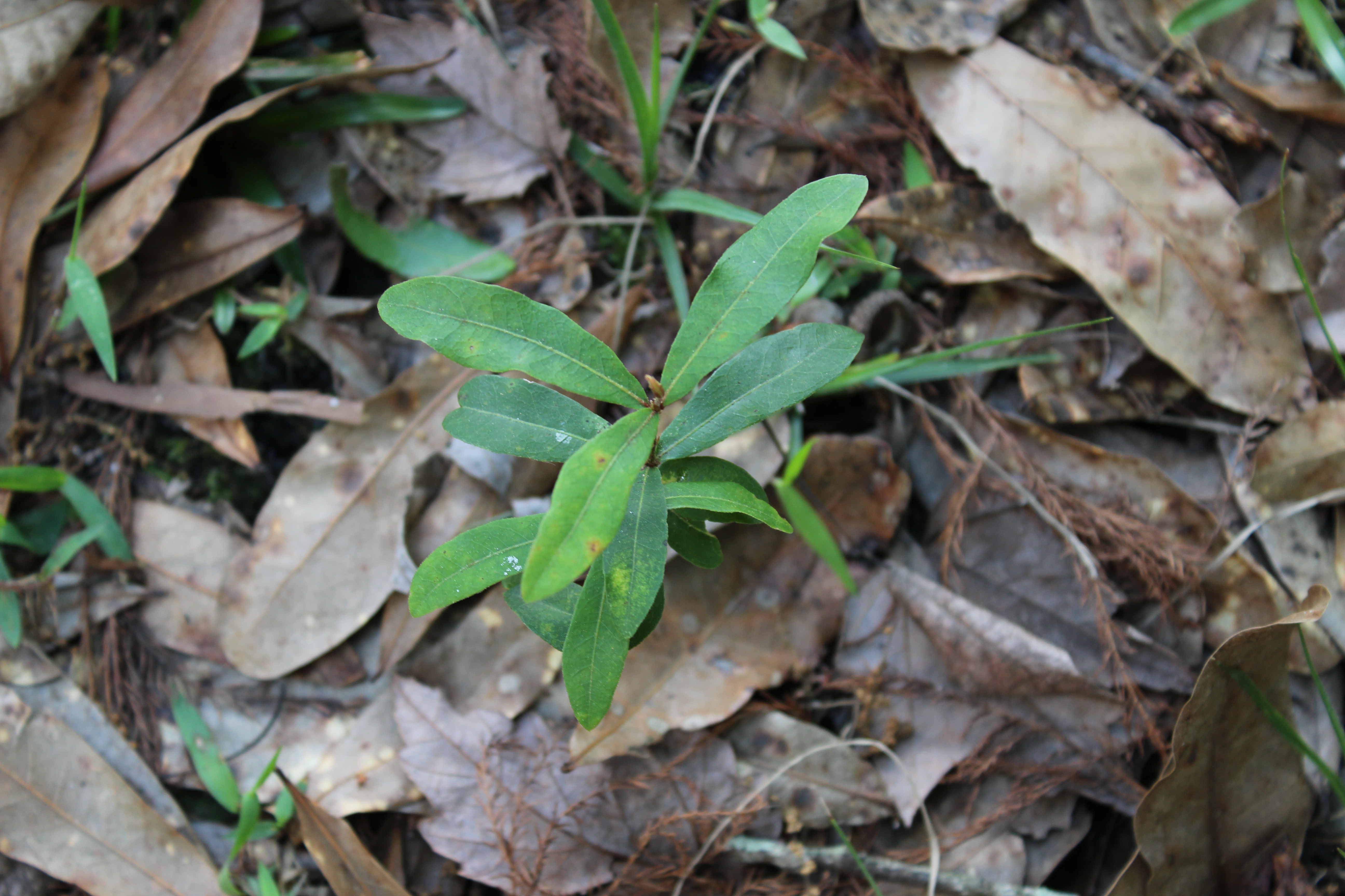 My neighbors on the other side have a fairly dense stand of laurel oak trees. I don’t even have to lift a finger to get a “new” shade tree as evidenced by this laurel oak seedling!